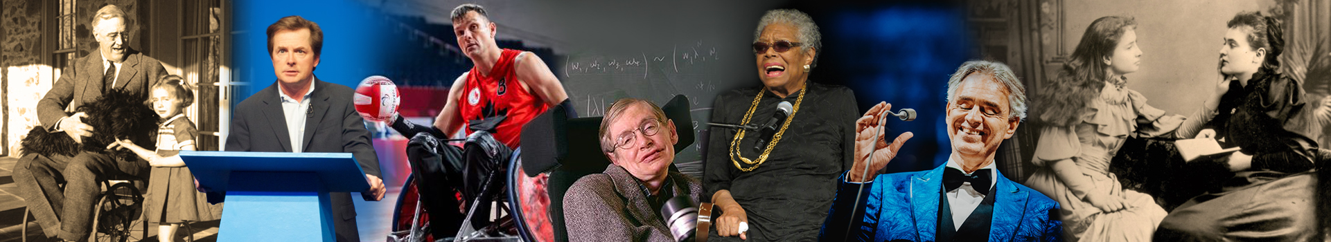 A collage from left to right: President Franklin D. Roosevelt sitting in his wheelchair holding a black dog and a young girl standing beside him petting the dog. Michael J. Fox standing behind a podium. Michael Whitehead in his Wheelchair Rugby Team Canada uniform holding a rugby ball in his right hand. Stephen Hawking in his wheelchair in front of notes on a blackboard, Maya Angelou standing with a cane behind a microphone. Andrea Bocelli reaching for a microphone. Helen Keller touching the lips of Anne Sullivan as she speaks to her.